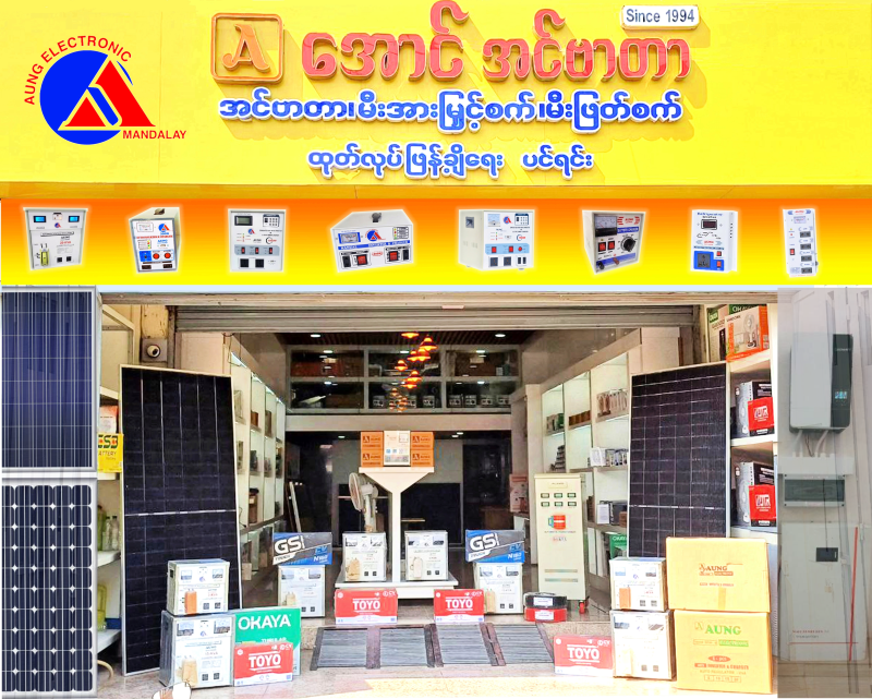 📌 Aung Electronics ကထုတ်လုပ်တဲ့ Auto Inverter များအပြင် Auto Transformer (Automatic Voltage Regulator) များ၊ Battery Charger များ၊ Safeguardများ နှင့် အခြား လျှပ်စစ်ပစ္စည်းများကို အမြို့မြို့မှာရှိတဲ့ (လျှစ်စစ်)စတိုးဆိုင်ကြီးတွေမှာလည်း သွားရောက်ဝယ်ယူနိုင်ကြပြီဖြစ်ပါသည်။